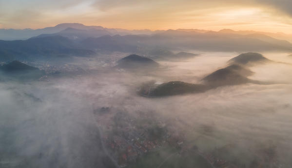 Aerial view of Franciacorta during a Sunrise, Lombardy district, Brescia province, Italy, Europe.