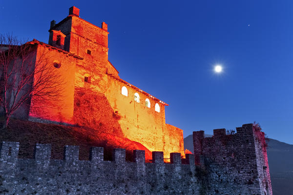 Ghostly night at the Noarna castle. In the 17th century it was the scene of a famous witch trial. Nogaredo, Trento province, Trentino Alto-Adige, Italy, Europe.