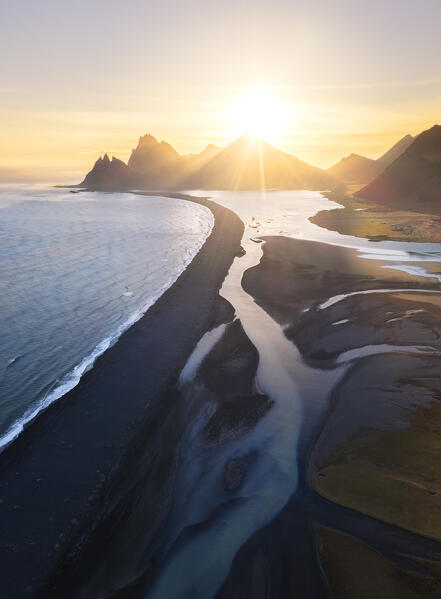 Vestrahorn and waves at sunset, Stokksnes peninsula, Hofn, Austurland, Iceland , Northern Europe