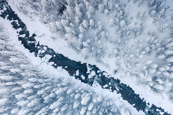 Aerial view of frozen river crossing the winter forest covered with snow, Switzerland