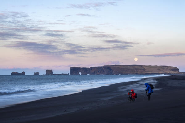 Basaltic columns and Reynisdrangar​ at Reynisfjara during sunrise, Vík í Mýrdal, southern Iceland, Iceland, Northern Europe