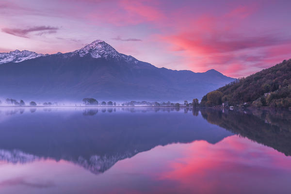 Sunrise on Legnone mount (Lecco province) reflected into Mera river from Dascio village, Sorico, Riserva Naturale Pian di Spagna e Lago di Mezzola, lake Como, Como province, Lombardy, Italy, Europe