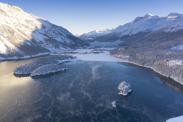 Aerial view of snowy woods and Sils Maria on shores of frozen Lake Sils, Graubunden, Engadin, Switzerland
