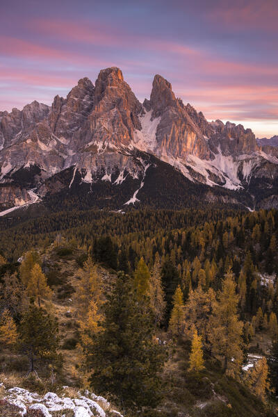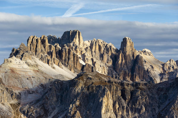 Italy,Veneto,province of Belluno,view over Fonda Savio Hut in the Cadini di Misurina group,with Picco di Vallandro and Monte Piana in the background