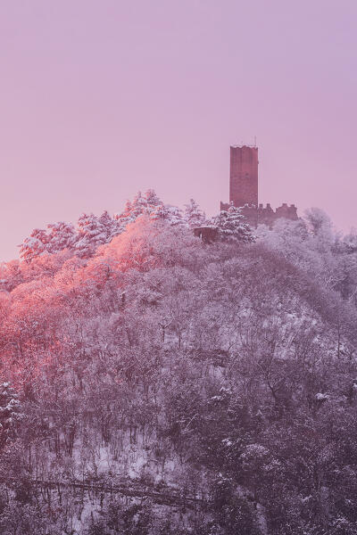 Sunset on Baradello tower (Castel Baradello) after the snowfall, Como city, lake Como, Lombardy, Italy, Europe