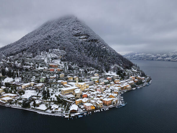 Aerial view of Peschiera Maraglio village in Montisola in winter season, Brescia province in Lombardy district, Italy, Europe.