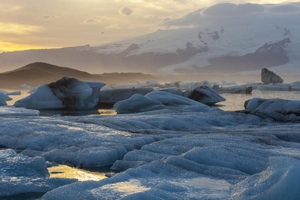 Blocks of ice at sunrise, Jökulsárlón, Diamond beach, Austurland, Iceland, Northern Europe