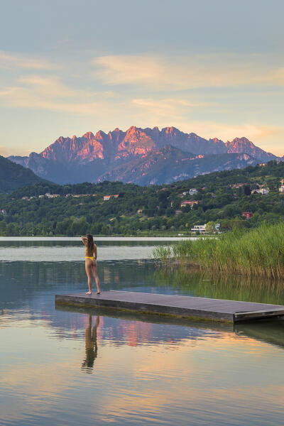 Girl relaxes and looks sunset on Resegone mount reflected into the Oggiono lake in summertime, Annone lake, Oggiono, Brianza, Lecco province, Lombardy, Italy, Europe (MR)