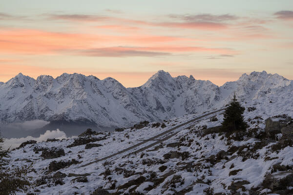 Aerial view of majestic snowcapped Vetta di Rhon peak in autumn, Piani di Rhon, Rhaetian Alps, Sondrio, Lombardy, Italy