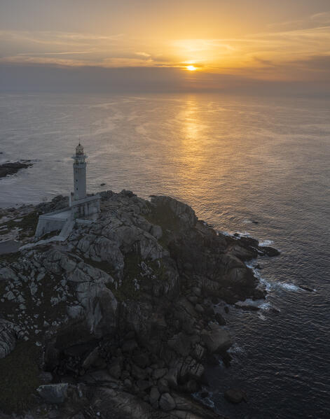Aerial view of Punta Nariga lighthouse at sunset, Costa da Morte, Galicia, Spain, Iberian Peninsula, Western Europe