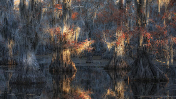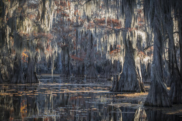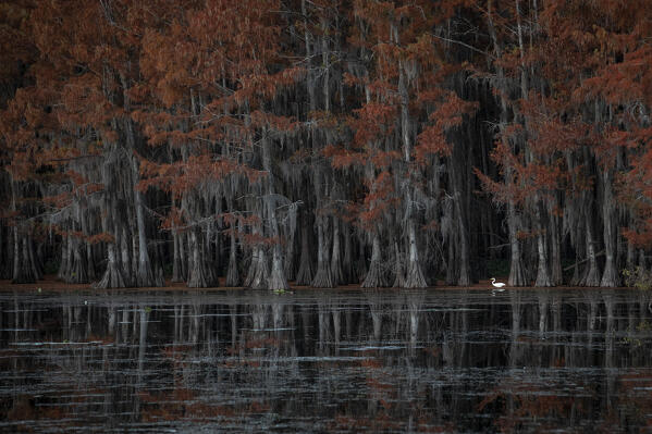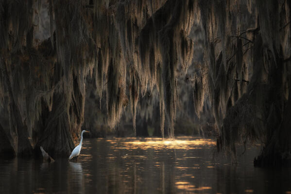 egret in Lake Martin at sunrise, Atchafalaya Basin, Louisiana