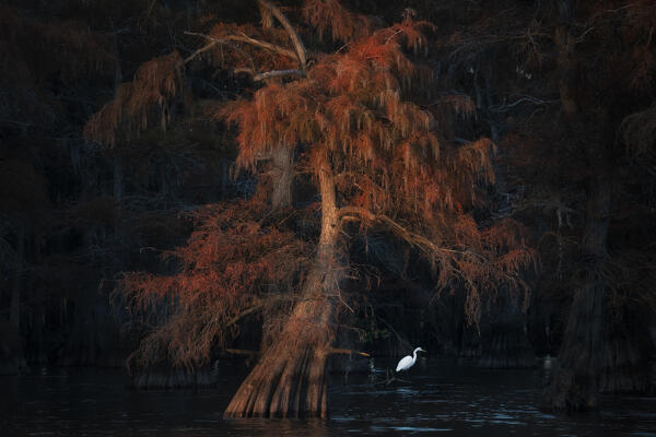 Great egret in Lake Caddo in Autumn, Texas
