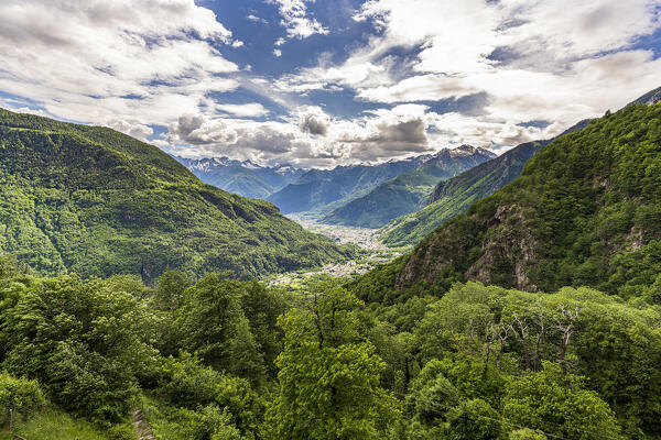 Cloudy sky over the green forest surrounding Valchiavenna view from Savogno, Sondrio province, Valtellina, Lombardy, Italy
