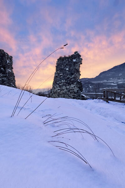 Winter sunset over the medieval ruins of Pradaglia Castle. Isera, Vallagarina, Trento province, Trentino Alto-Adige, Italy, Europe.
