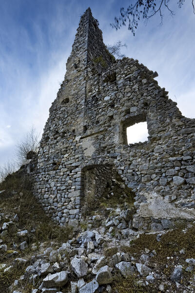 The medieval ruins of the Castellalto keep. Telve, Trento province, Trentino Alto-Adige, Italy, Europe.