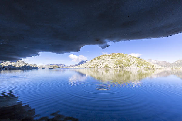 The ice begins to melt at Lake Hemet at thaw. Madesimo. CHiavenna Valley. Spluga Valley. Valtellina. Lombardy. Italy. Europe