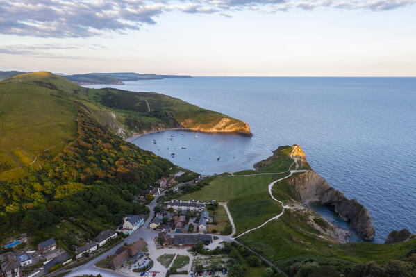 Aerial view of Lulworth Cove at sunset with boats, Durdle Door, Dorset, United Kingdom, Northern Europe