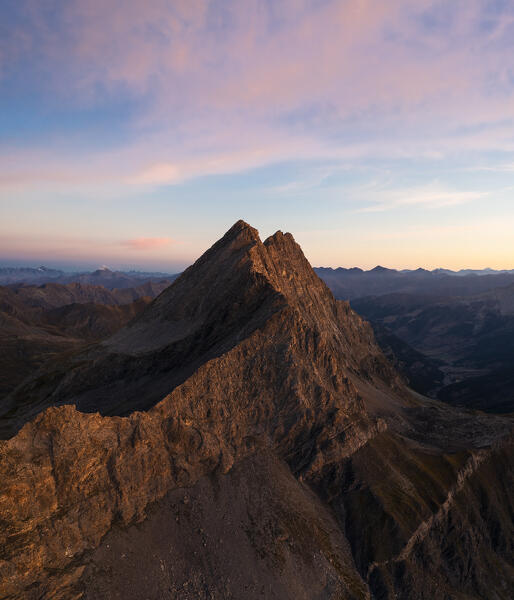 A trekker observes Crete de la Taillante from Pain de Sucre during dusk at summer, Pain de Sucre, Col Agnel, Alpi Cozie, Cuneo, Provance, Piedmont, France, Italy, Southern Europe