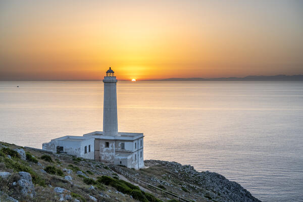 Otranto, province of Lecce, Salento, Apulia, Italy. Sunrise at the lighthouse Faro della Palascìa. This lighthouse marks the most easterly point of the Italian mainland. In the background you can see mountains of Albania