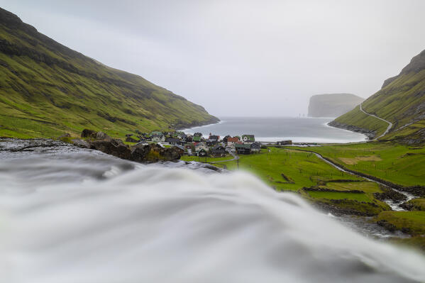 Small waterfall and Tjørnuvik village, Sunda municipality, Streymoy, Faroe Islands, Denmark, Scandinavia