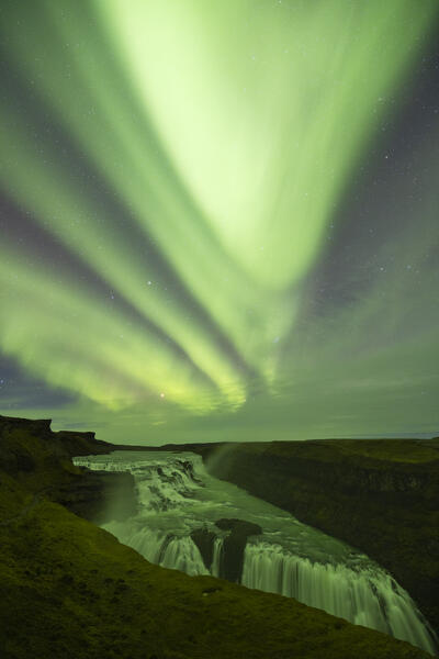 the Northern Lights over iconic Gullfoss waterfall during an autumn night, Iceland, Europe