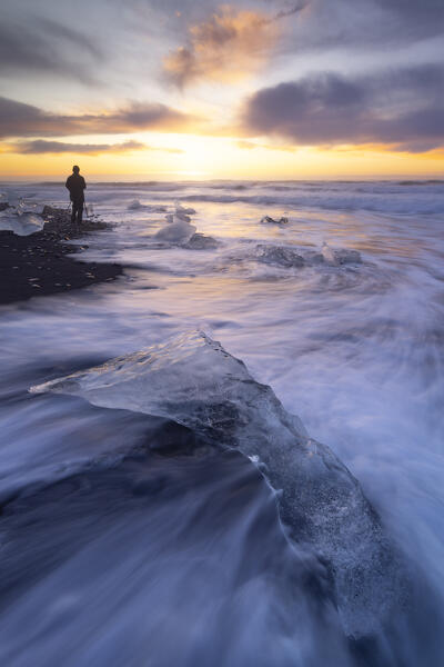 the ice blocks of the famous Black Sand Beach with a photographer in foreground, taken during an autumn sunrise, Jokusarloon, Iceland, Europe