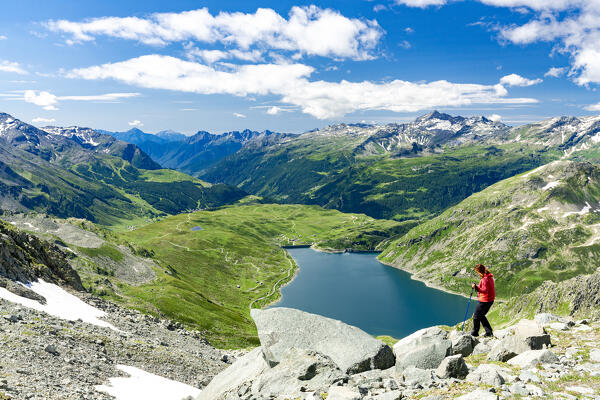 Cheerful woman enjoying a summer hike nearby an alpine lake, Madesimo, Valle Spluga, Valtellina, Lombardy, Italy