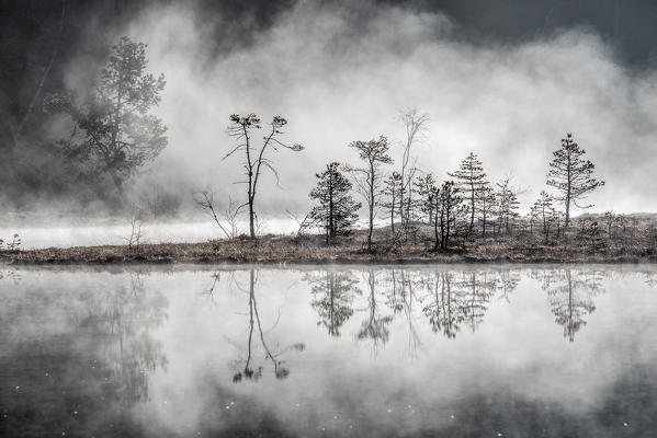 Typical mists of spring at Pian di Gembro. Aprica. Valcamonica. Valtellina. Lombardy. Italy. Europe