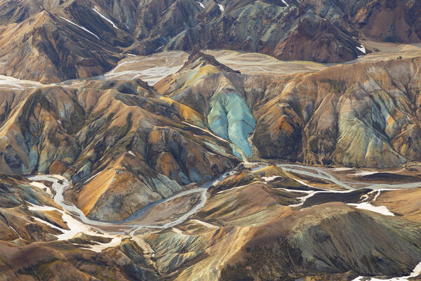 aerial view taken by drone of natural texture in Landmannaugar area during a summer day, Iceland, Europe