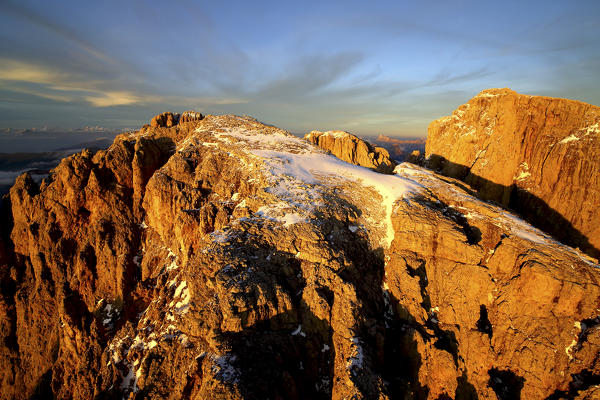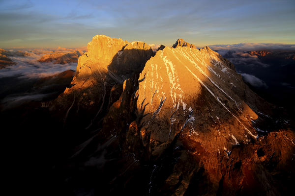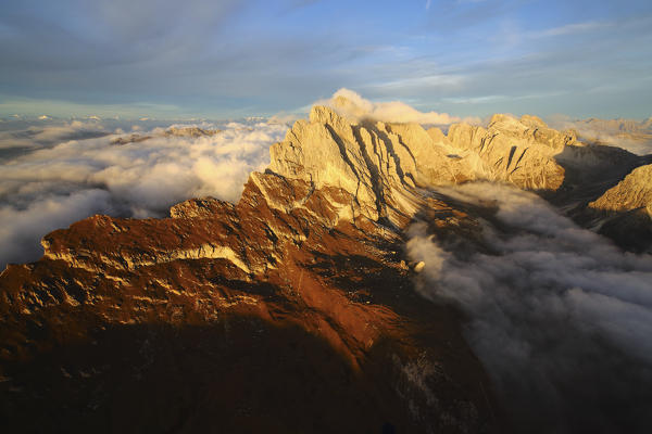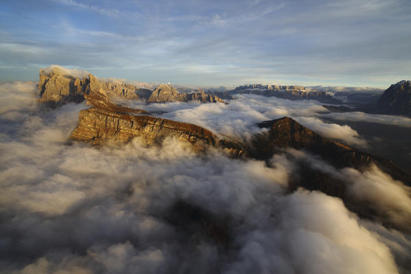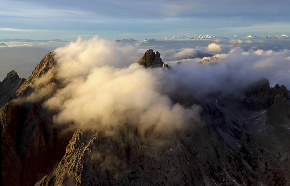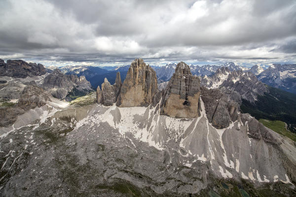 Aerial view of the Three Peaks of Lavaredo on a cloudy day. Dolomites. Cadore. Veneto. Italy. Europe