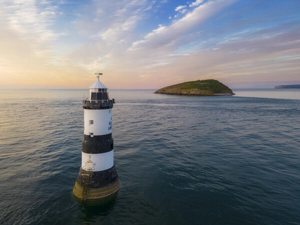Aerial view of Trwyn Du Lighthouse at sunset, Llangoed, Gwynedd, Anglesey, Wales, Great Britain, United Kingdom