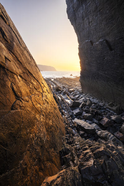 Blackchurch Rock and Mouthmill beach at sunset, Mouthmill, North Devon, England, Great Britain, United Kingdom