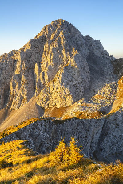 Sunrise in front of Pizzo Camino, Vallecamonica in Brescia province in Lombardy district, Italy, Europe.