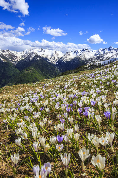 Flowering Crocus with views of the peaks of Valgerola. Valtellina. Lombardy. Italy. Europe