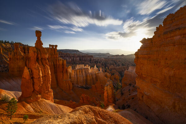 the sunlight envelope the canyons of Bryce Canyon National Park during a summer sunrise, Utah, United States of America