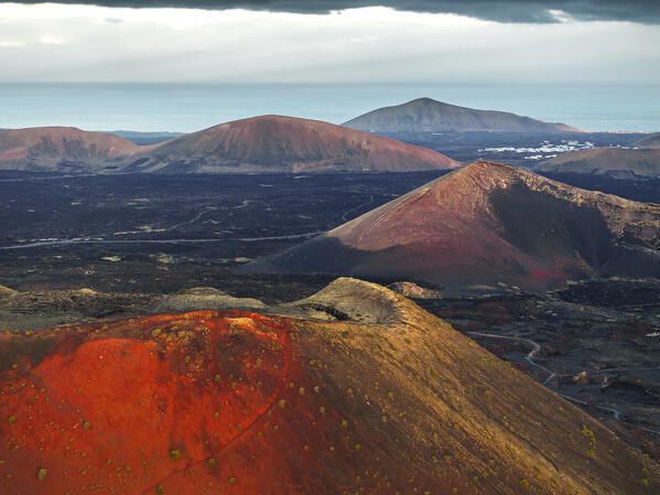 Aerial view of the crater of Caldera Colorada and lava fields, Tinajo, Las Palmas, Lanzarote, Canary Islands, Macaronesia, Spain, Western Europe