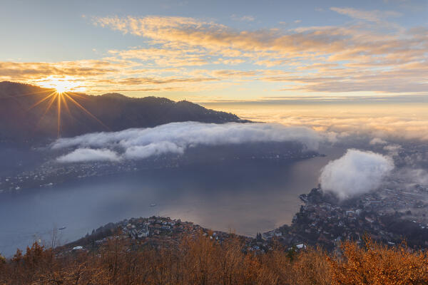 First ray of sunshine on lake Como, Brunate and Cernobbio town, Como province, Lombardy, Italy, Europe