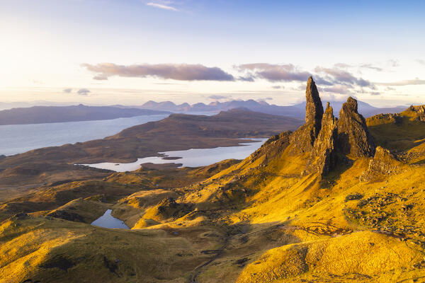 Aerial view of Old Man of Storr during sunrise, Isle of Skye, Inner Hebrides, Trotternish peninsula, Highlands, Scotland, United Kingdom