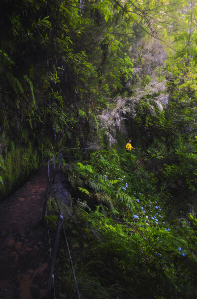 A tourist admires Risco waterfall, Levada do Risco, Rabacal, Paul da Serra, Madeira region, Portugal, Western Europe