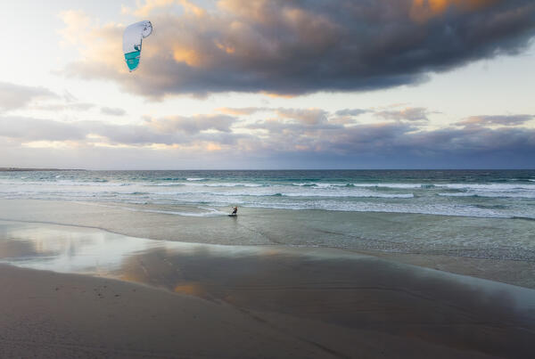 Aerial view of a man kitesurfing at Famara beach, Caleta de Famara, Las Palmas, Lanzarote, Canary Islands, Macaronesia, Spain, Western Europe