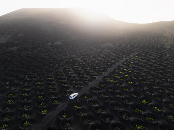 Aerial view of Timanfaya National Park at sunrise, Yaiza, Tinajo, Las Palmas, Lanzarote, Canary Islands, Macaronesia, Spain, Western Europe