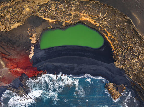 Aerial view of Charcos de Los Clicos at sunset, El Golfo, Yaiza, Las Palmas, Lanzarote, Canary Islands, Macaronesia, Spain, Western Europe