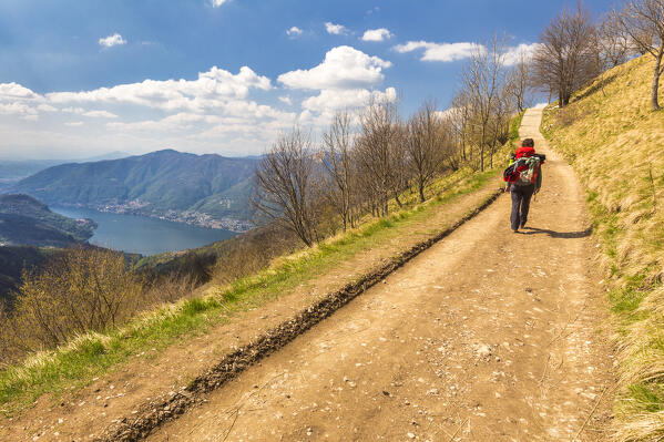 Hiker walks on the path to reach Rifugio Riella, Palanzone mount, Faggeto Lario, lake Como, Como province, Lombardy, Italy, Europe (MR)