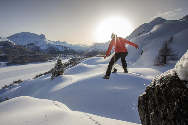 Hiker jump in fresh snow at the Maloja pass. Canton of Graubunden. Engadine. Switzerland. Europe