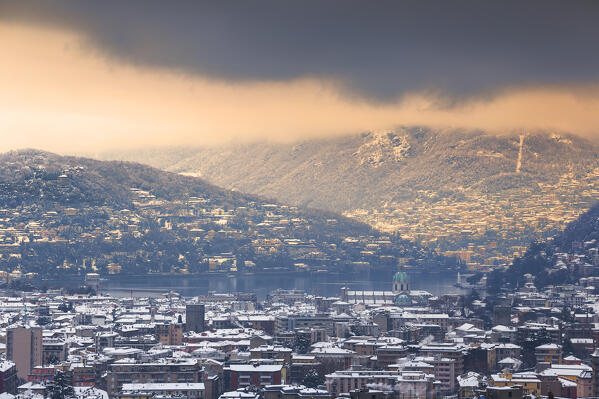 A summer view of lake Como, Brunate, Como city and the St. Donato hermitage (Eremo di San Donato), Lombardy, Italy, Europe