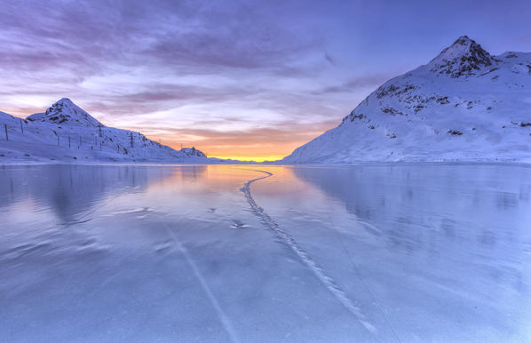 Lines created by the frost on the frozen Lake Bianco. Bernina Pass. Canton of Graubunden. Engadine. Switzerland. Europe
