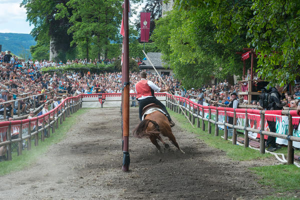 Presule, South Tyrol, Italy. The ride through posts at Castle Presule. Neither horse nor rider may touch the posts