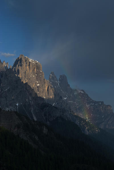 Passo Rolle, Dolomites, Trentino, Italy. Rainbow in the Pala mountains with the peaks of Cima di Ball and Sass Maor