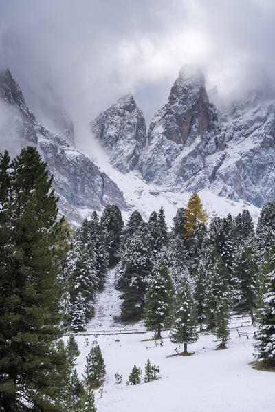 Funes Valley, Dolomites, South Tyrol, Italy. The church San Giovanni in Ranui and the peaks of the Odle