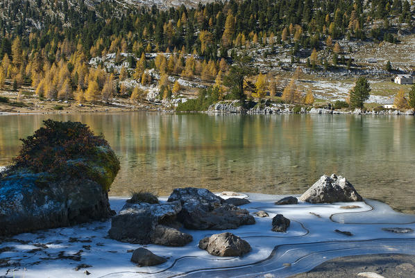 Fanes, Dolomites, South Tyrol, Italy. Autumn at the Lago Verde/Gruensee near the refuges Fanes and Lavarella